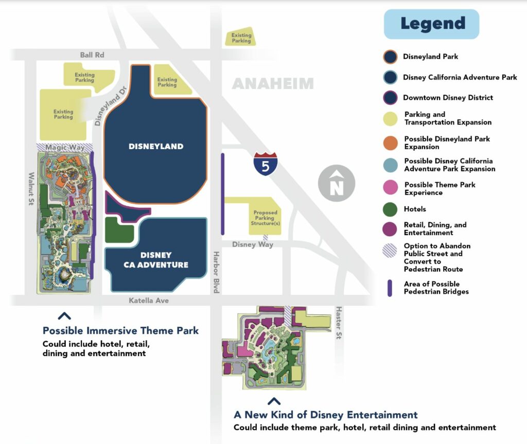 Based on the map, there is a possibility of a new immersive theme park which would feature a new hotel, shops, restaurants and entertainment. A Disney California Adventure Park expansion including parking and transport could also be put in.