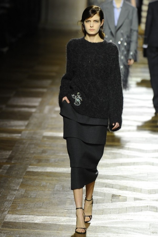 Van Noten announced said invasion from the first look out, an amply proportioned coat with explosive red and gold embroidery down one side, belted in a skinny strip of crystals and worn over gray trousers. He continued on with the tailoring — a twist on the three-piece suit, here a jacket over skirt over pants; trompe l’oeil dresses that appeared to be layered pieces. With the British wools as his base, the designer sometimes introduced rich, pale brocades into the mix. Almost every look bore some fusion of masculine and feminine: the austerity of a jacket and pants interrupted by an all-over fringed chemise; the collegiate dash of a big, striped sweater countered with an embroidered velvet skirt. Another sweater look — slouchy dark gray knit over a tiered, tailored skirt — got its girly glow from a giant “diamond” brooch placed on the hip.