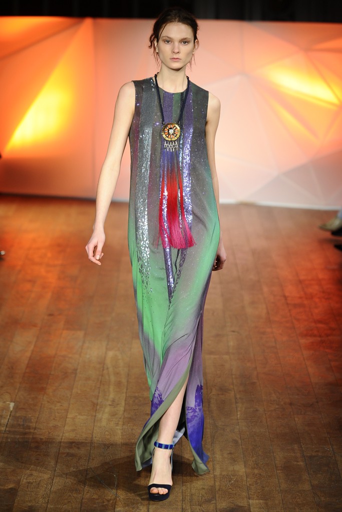 In-house jacquard prints, knife pleats, embroidery, sequined evening wear in acid brights of yellow, green and blue with the same pops of bright orange and purple shades that Paul Smith showed. The swishy gowns were a standout for me topped off with just the right crystal and gemstone accessories.