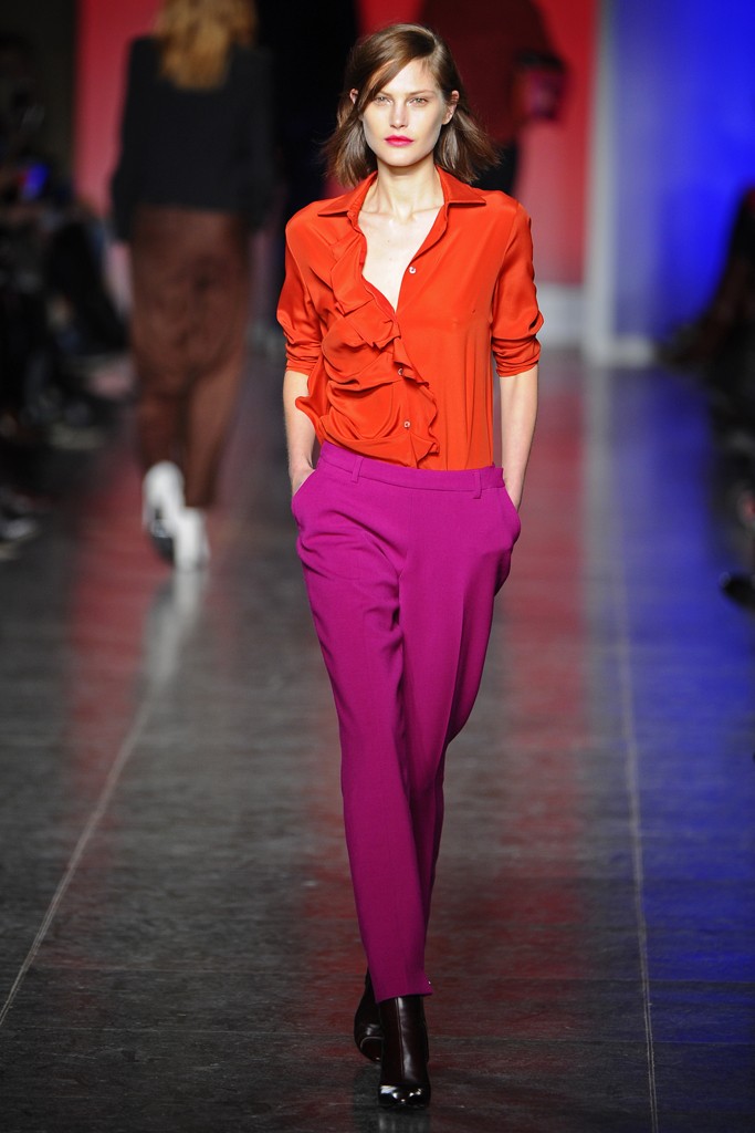 While the designer experimented with some minidresses in graphic stripes or gleaming metallics, the men’s wear-inspired looks were the strongest: Bathrobe-easy wool coats with batwing sleeves; handsome bi-color blazers; and sexy, tapered trousers that zipped over white boots that are meant to be worn after Labor Day. The offbeat combinations – purple jacket, fuchsia top, rust pants – telegraphed the show’s jaunty, devil-may-care spirit. Even ruffles on silk blouses were as unstudied as excess piecrust, coiling around each arm, or bunched up on only one side.