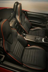 The interior is attractive, mostly lifted from the Miata, but with upgraded leather and materials that give it a little Italian flare. The aforementioned drop top is a snap to use, and can be easily opened or closed from inside the car. My favorite feature – aside from the standard heated front seats, which I love in any vehicle – were the speakers mounted in the headrest which provided clear sound for hands-free calls and jamming to the premium Bose sound system with the top down.
