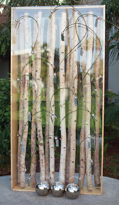 Acrylic is a very hot trend in weddings. This design speaks to the more modern couple. An oversize custom acrylic box incased with suspended birch wood poles is a show-stopping piece that will get guests excited to enter the reception.