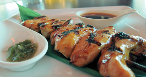 Chicken Yakitori. This Thai curry-marinated chicken is served with an assortment of scrumptious dipping sauces.
