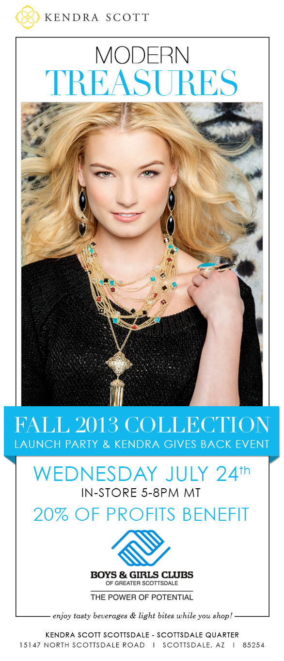 This Wednesday, July 24, Kendra Scott at Scottsdale Quarter will double the fun with the launch of the Fall 2013 collection and "Kendra Gives Back." Kendra Scott will donate 20 percent of proceeds from in-store purchases made from 5 to 8 p.m. to the Boys & Girls Clubs of Greater Scottsdale. You are also invited to browse the newest gems from Kendra Scott's fall collection while you enjoy tasty beverages and light bites. For more information on Kendra Scott, visit www.kendrascott.com.