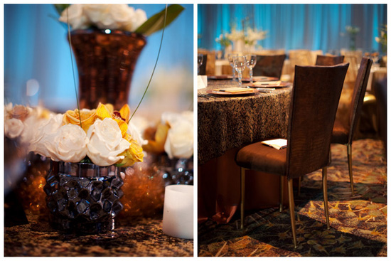 We wanted to share with all our readers about an exciting event that we were a part of in January that was held at the Phoenix Convention Center. Heather and I were asked to be the co-chairs for The Special Event 2011 Wedding Lunch.  We produced the whole event for over 700 wedding professionals from all over the country. The theme we created was “In Love with Metallics”. We wanted to show industry professionals different metallic elements and how to pair them in your next event.  There were great wedding table designs, a fashion and cake gallery and 7 design galleries. We hope you enjoy all the beautiful work that we will showcase in the next few articles. Today I want to share the details of the entrance, the table designs and the stage design that was debuted to all attendees. All photos shown were shot by Melissa Jill Photography. We hope this inspires you to use metallics in your upcoming events!