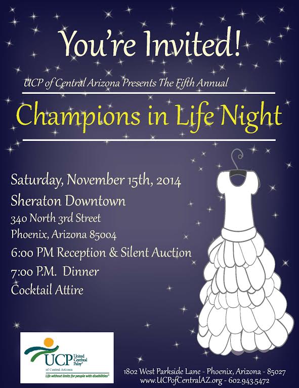 United Cerebral Palsy of Central Arizona (UCP) is proud to announce the 2014 Champions in Life Night “Fashion without Limits” Gala on Saturday, November 15, 2014 at the Sheraton Phoenix Downtown. Champions in Life Night was established in 2010 by UCP to recognize the ongoing commitment and unwavering support of Circle K, the 2014 UCP Champion Sponsor.