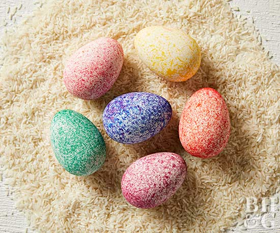 Mix some food coloring into a bowl of uncooked rice and mix. Once you have the color you would like, go ahead and dip the egg into the mixture to transfer the pattern onto the shell. The egg will need time to dry but will have a fun, freckled design. For more details, click here.