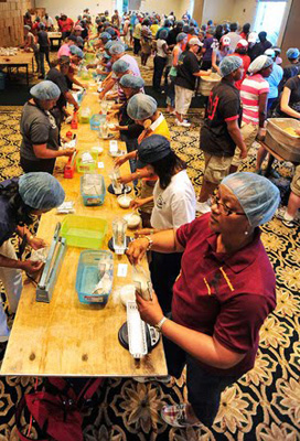 (Volunteers at a recent event, assembling close to 300,000 meals)