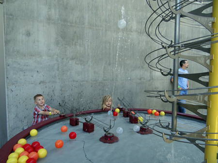 This exhibit, located immediately after you enter the museum, is actually outside.  It has so many machines and fun ways to, well, shoot water and plastic balls around.  We probably would have spent our entire day out here - both kids went from each station and really loved seeing were the red ball went after it landed on a certain area - it was fun.  You can see Jeremiah shooting a ball into the air to try to get it into a basket at the top.