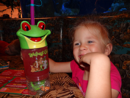 There is one place in the valley where you can eat lunch surrounded by exotic plants, fish, and wild animals - Rainforest Cafe!   The Rainforest Cafe at Arizona Mills is a fun and laid back spot for lunch or dinner - and is especially a hit with the kiddos.  First, they're definitely a kid-friendly and family-focused restaurant.  As you can see in the photo above, Sarah loves her Cha Cha (the tree frog) cup filled with raspberry lemonade ($7.99).  The children's menu is extensive and ranges from ribs and pasta to burgers and pizza.   Jeremiah and Sarah split a Shrimpkens meal (popcorn shrimp and dino-shaped chicken nuggets) and had sides of fries and carrot sticks.