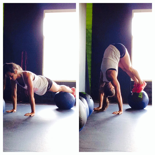 Start in a plank position with feet on the ball, shoulders, elbows, wrists all in line. Using your feet, roll the ball towards you, piking your butt up into the air and looking at your belly button, return to starting position. Make sure to not let the hips drop and think about pulling your bellybutton to spine.