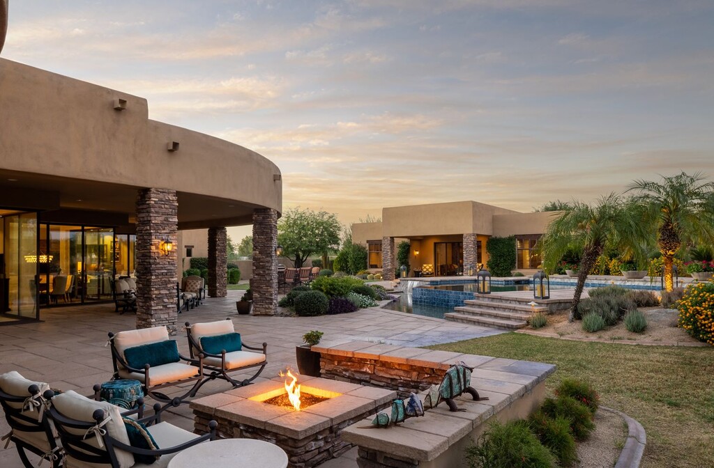 Outside, the estate truly shines. Lush, layered landscaping frames a raised negative-edge pool and spa, creating a resort-style atmosphere. A serene fire-pit gathering area and multiple covered patios offer spaces for intimate evenings or large-scale entertaining, all while taking in the panoramic desert and mountain vistas.