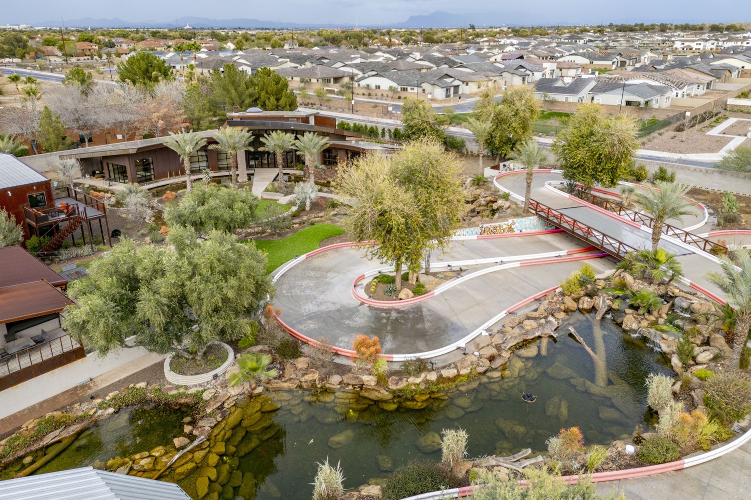The full-scale go-kart track is one of the property’s most eye-catching features, a winding, professional-grade course that turns the backyard into a high-speed adventure. It’s large enough for rides with friends and family yet close enough to home that a quick spin is as easy as slipping outside after dinner.