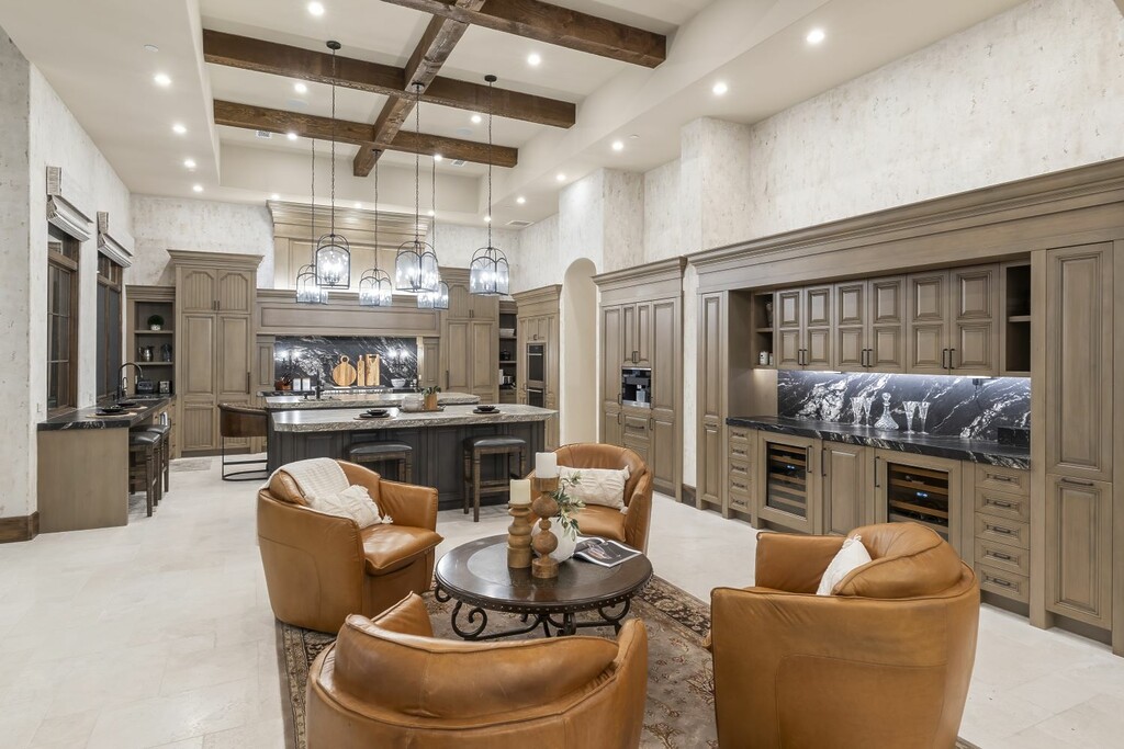 The chef’s kitchen features high-end appliances, a six-burner gas range, and generous prep and storage space, all framed by custom cabinetry. A Savant Smart Home System puts complete control of lighting, security, temperature, sound, heaters, misters, and more into the homeowner’s hands, while an eight-car garage equipped with lifts caters perfectly to automotive enthusiasts.