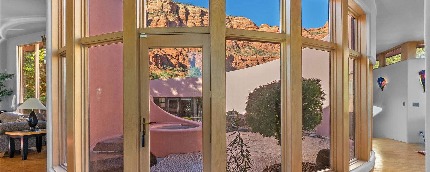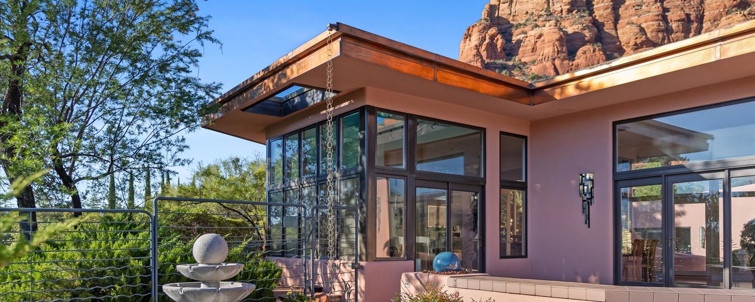 Nearly hidden from the road, the residence opens around a flowing spiral fountain and atrium at its center, with expansive walls of glass framing the red rocks and spires that define Sedona’s skyline. From just outside the front door, residents can take in direct views of the iconic Chapel of the Holy Cross.