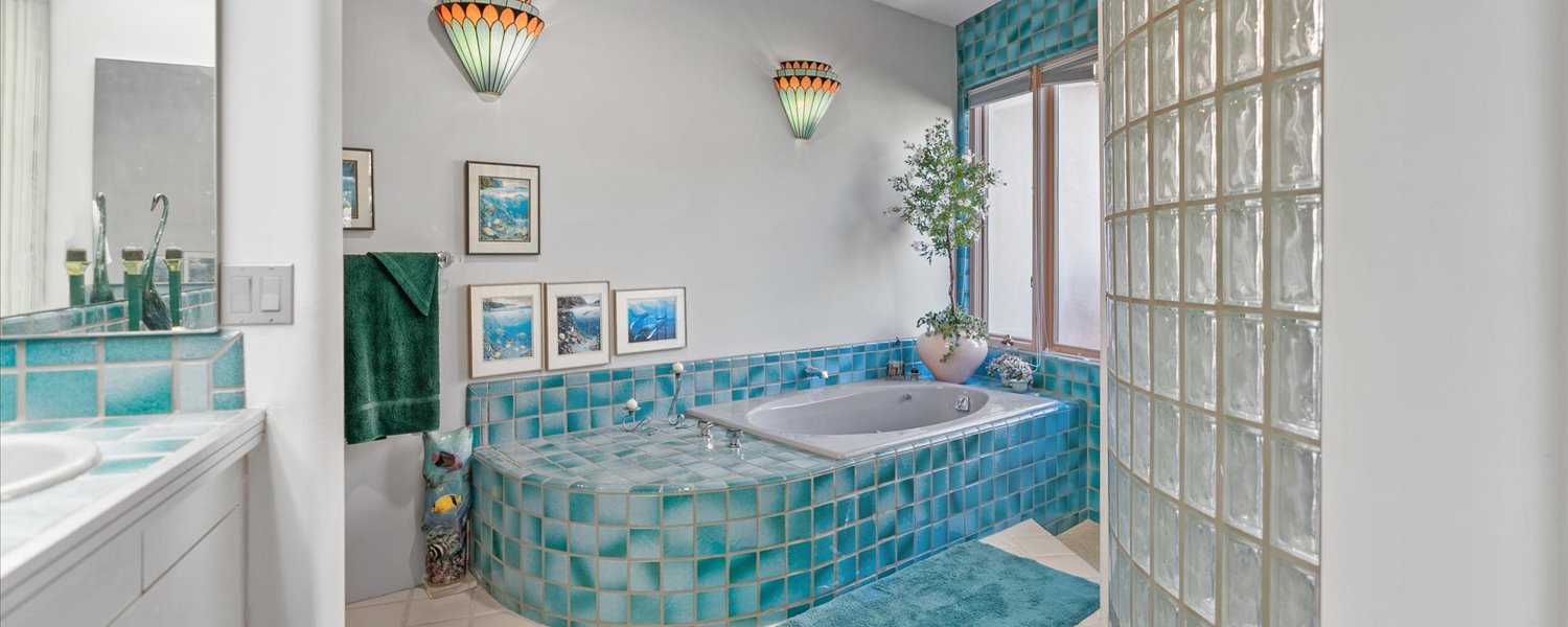 The home also includes a private guest suite with its own entrance, an office that can serve as a third bedroom, a tranquil sunroom, and bathrooms accented with stainless steel wraps and lacquered gradient tiles. Artistic details abound, from sculpted plaster fireplaces and a mural by Stan Natchez to a hand-carved entry door by Bryon Wickstrom, stained-glass lighting by Tom Aderhold, and intricate ironwork by Mark Finn.