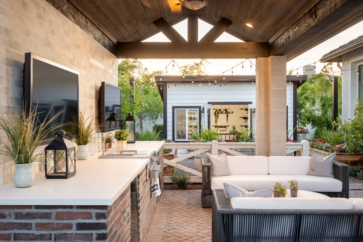 “One of the most important features in the flow of a home is its connection to the exterior. Successfully creating a functional outdoor living space means making an extension to your indoor living area. This outdoor space does just that. The use of the brick flooring material carries outside to create a seamless transition connecting the two spaces. Panoramic sliding doors that fully retract into the walls open the spaces up even more and create an even more fluid flow inside to out. Multiple vignettes were created so a large family can fully enjoy their outdoor space. Creative problem solving with space planning was key in the flow of connecting these vignettes. The lot is wide and narrow with ample side yard space and we took advantage of it. Locating the pool straight off of the main living area is a common approach. In this design, location of the pool was placed off to the side, segregating one side of the yard with cabanas, corn hole and loungers. The central portion of the outdoor space, directly off of the common living area, is for relaxing, dining and cooking. The right side portion of the side yard offers more private areas, equipped with a she shed for the lady of the house’s personal interests and private hot tub off of the master suite. With a family this large, everyone needs their own space, and this outdoor space functions perfectly for the end user.”