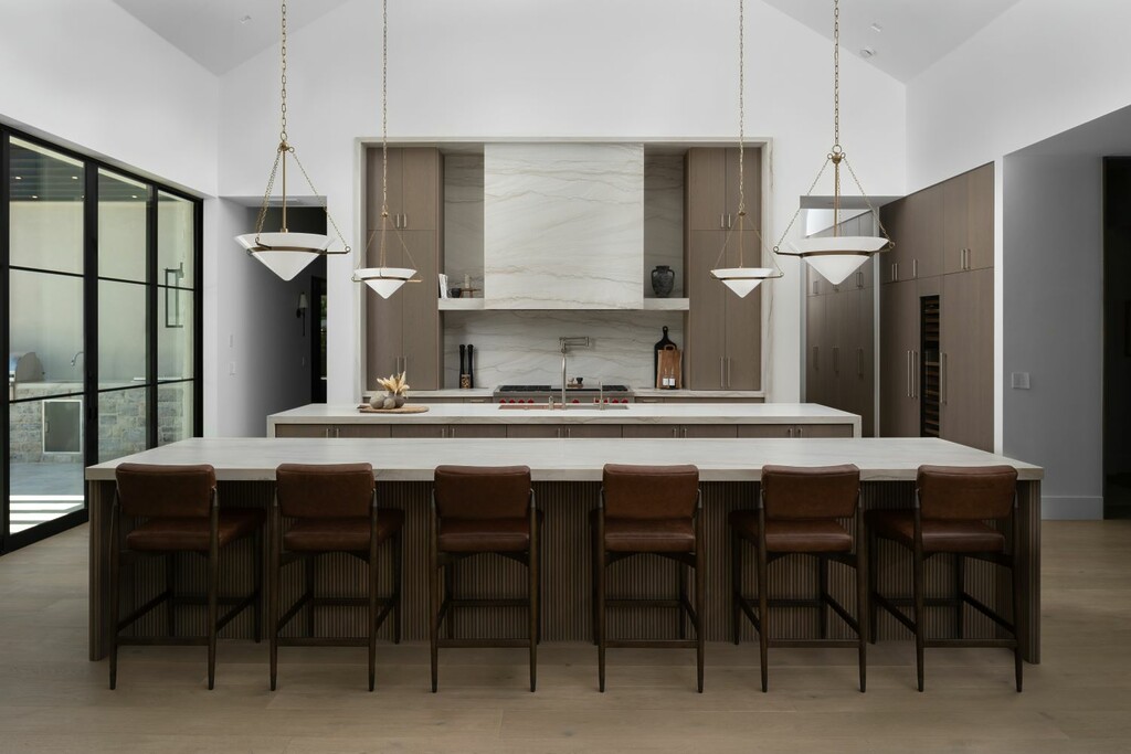 Designed by the prestigious Grey Collective, the estate’s interiors reflect a harmonious blend of natural, organic textures, offering warmth and a sophisticated sense of tranquility. The kitchen has two large islands, top-of-the-line Wolf and SubZero appliances, a built-in Wolf coffee maker and an ice machine. One of the standout features of the home is the custom wine display, crafted from rift white oak with leather handles, designed to create a seamless transition between the kitchen and dining room.