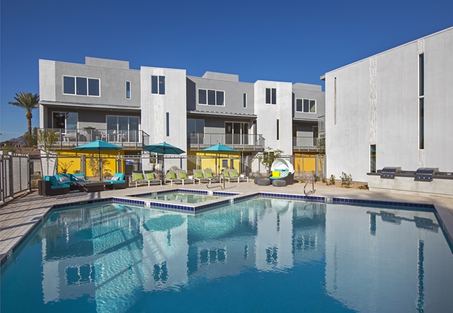 Desirable elements like two-car garages are available for each unit, as well as a heated pool and spa, firepits and barbecues for community use. The great indoors impress just as much with quartz countertops, shaker wood cabinets, Samsung appliance packages, contemporary fixtures, oversize tile showers, open-concept living and expansive sliding-glass doors that leave to the patios.