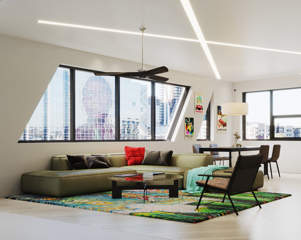 A rainbow-hued ceiling installation by Porter Barn Wood transforms the lobby, complemented by a walkway art installation by Räkkhaus, installed by Creative Paving. The ground floor houses retail space, a restaurant concept, and a fitness studio, while the exterior is framed by custom-designed bike racks and benches shaped after the Rainbow Road track, fabricated by artisan Spectacle Works.
