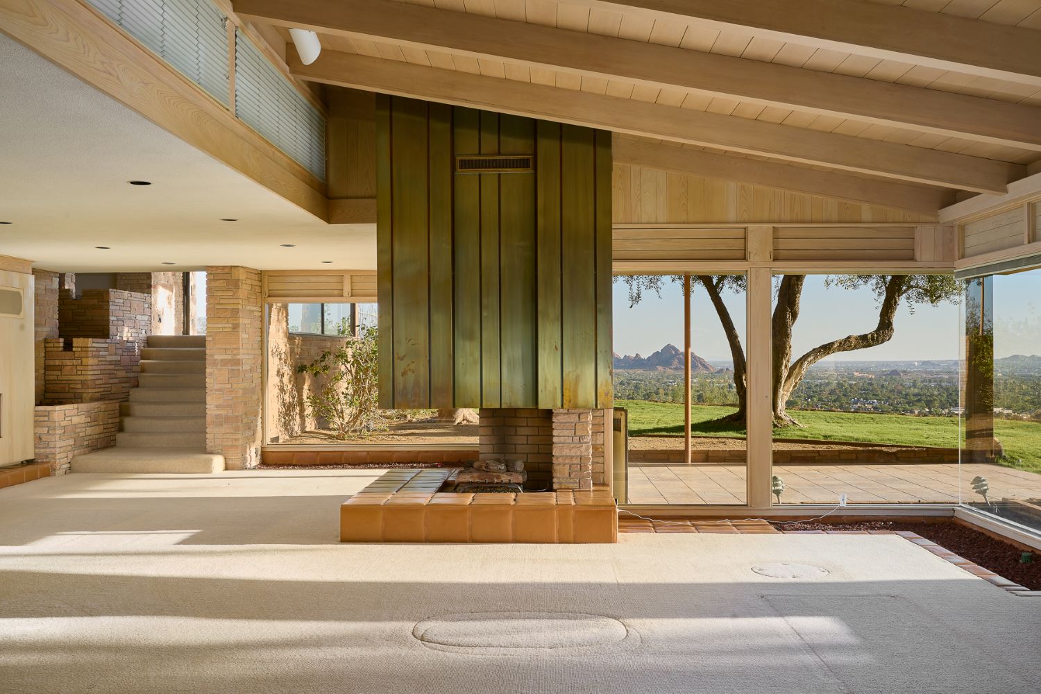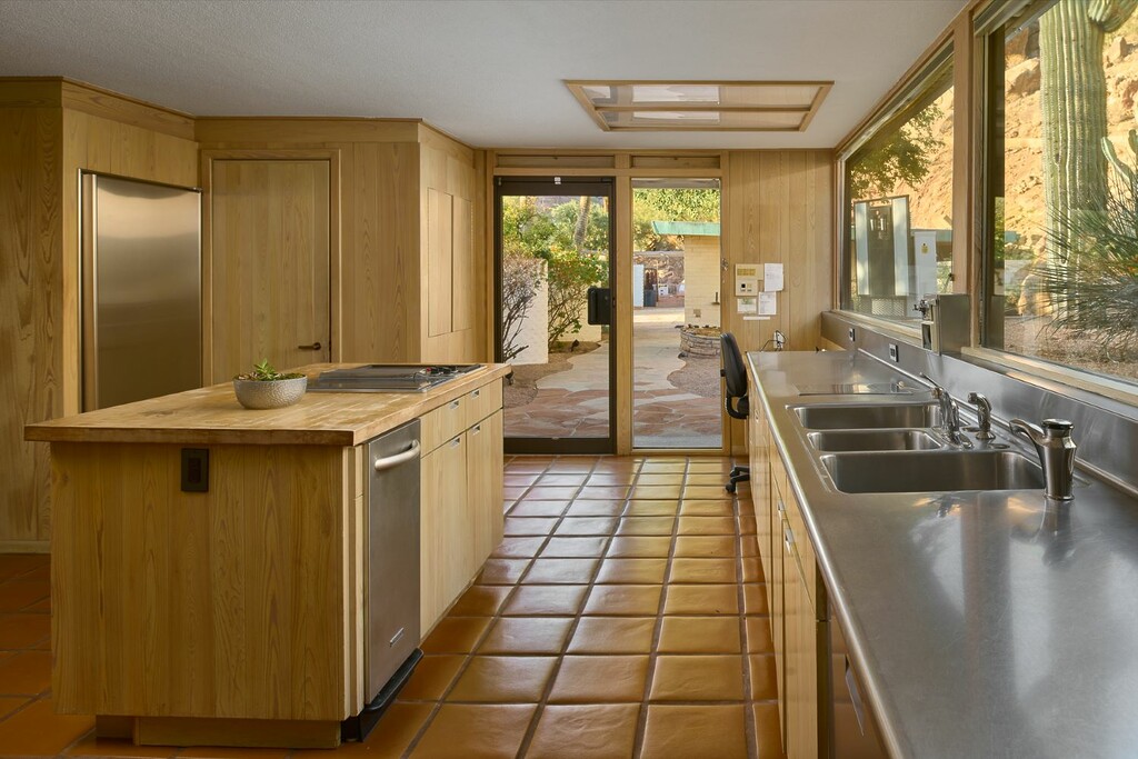The existing 4,661-square-foot home, built in the early 1970s, reflects Frank Lloyd Wright’s architectural influences. Its design blends with the mountain, even incorporating natural granite into the master bath. Later remodeled by architect Earle Florence, the house showcases sweeping views of the Phoenix skyline and the southern metro valley.