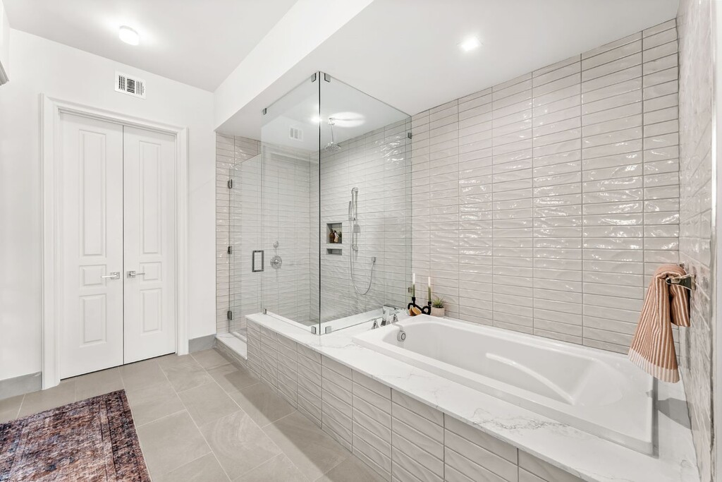 Every residence is designed for elevated living and entertaining. Soaring ceilings and waterfall kitchen islands anchor open-concept interiors, complemented by quartz countertops and premium Wolf appliances. A built-in bar with an ice maker and a wine refrigerator enhances the hosting experience, while a powder bath off the main living area adds convenience for guests.