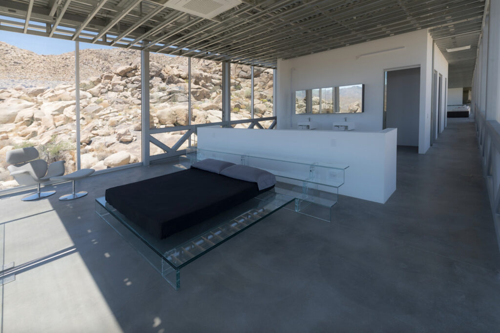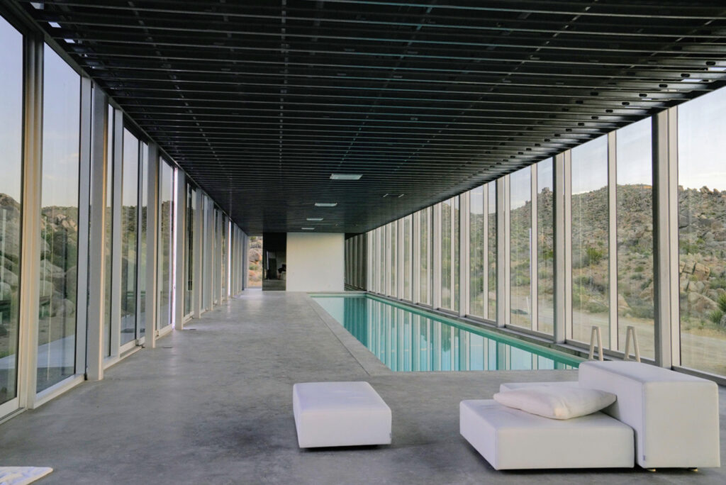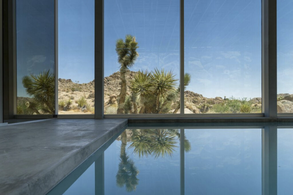 The three-bedroom home features a mostly open layout with corrugated steel 11-foot ceilings and luxurious living spaces, including a master suite with clear glass walls that offer endless views of the desert terrain and a 100-foot-long indoor solar-heated pool adjoining the living room and Boffi entertainment kitchen.