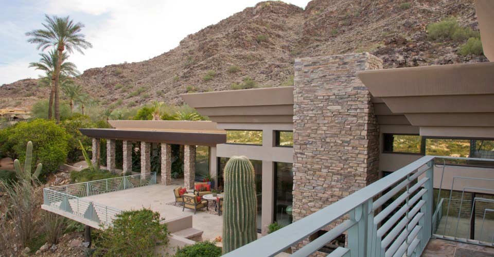 Built in 2008, this 7,500-sq.-ft. contemporary home overlooks the 18th hole of a golf course in North Scottsdale. Stacked-stone exterior walls contrast with the radiused copper roof, balcony and pool and spa, whose sinuous lines intensify the overall drama and rhythm.