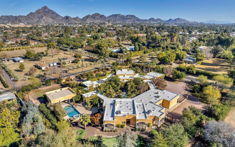 Located in Paradise Valley's Club Estates, this private estate features views of Camelback Mountain and Mummy Mountain. Amenities include indoor-outdoor living spaces, a negative-edge pool, a movie theater, a stone wine cellar, and a chef's kitchen. The property also has a 6-car garage.