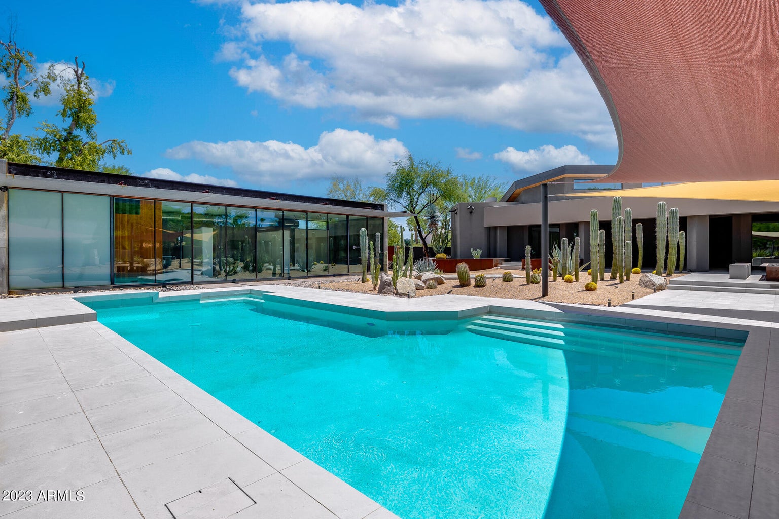 A reimagined mid-century house in Paradise Valley, with sweeping mountain views, gated privacy, and a tranquil atrium. Boasts a chef's kitchen, split primary suite, multiple patios, pool, BBQ area, pickleball court, and citrus grove, on an acre lot. Rebuilt in 2018.