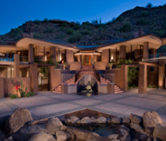 STANDOUT FEATURES: “The two-story 8,988-sq.-ft. home sits unobtrusively on the east side of Camelback Mountain. Its radial-plan design provides panoramic views to the north and east and an immediate mountain backdrop to the south and west. Much of the architecture is expressed and exposed. Materials include Mesa stone (a smooth, integrally colored block with aggregate) and stepped split-faced masonry for the walls and columns, which rise 20 to 30 feet; water-jet-cut large-format granite floors and decks with flamed finish, shaped to follow radial floor plan design (each piece is unique in size and shape—up to 4-feet wide and 4-feet thick, and therefore had to be numbered for placement); exposed structural steel for support and cantilevered shade trellises; and extensive spans of high-performance glass. Water features are prominent. At the entry drive court, a natural water feature with native boulders and cascading water provides a visual and acoustical arrival experience; water is also integrated into the steps and paths to the entry door and forms a backdrop to sculpture gardens. One of the sculptures is a large bronze boar created by the artist that created a similar boar displayed in a public plaza in Florence, Italy. The boar is well-known for offering good luck by rubbing its snout. Also, on the mountain side, the cut to the mountain was reconstructed with boulders, over which water cascades to a reflecting pond directly adjacent to the dining room and gallery windows, providing an intimate connection to the mountain.”