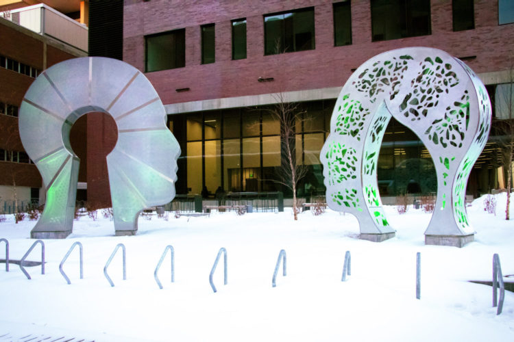 For example, Grygutis’ “Dialogue” sculpture resides at the University of Minnesota Health Sciences Learning Center, representing and highlighting important human interactions necessary for public health including the ability to listen and the ability to dialogue.