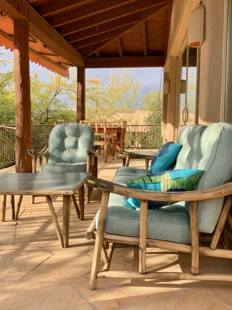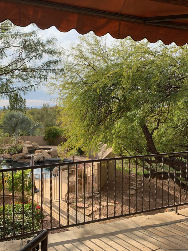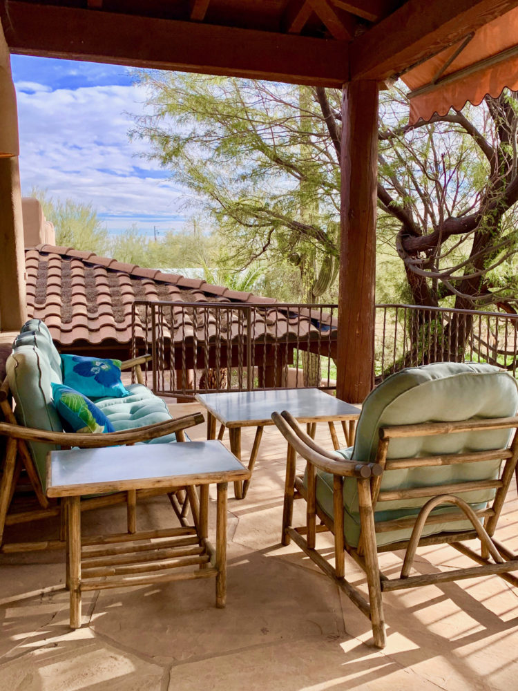 The moment you enter the gate and drive onto the gravel driveway, you sense that you have arrived at someplace special. This 2 1/2 acre ranch is surrounded by raw desert filled with some of the oldest Saguaros in Arizona. It provides us with an ever changing 360 degree view of the mountains resplendent in turquoise, gold, peach and sapphire sunsets. Old growth plantings and deeply shaded patios and balconies beckon you to rest in their antique willow chairs until you completely unwind listening to the birds, wind chimes and the trickle of a waterfall. Five horses (two with Secretariat bloodlines) romp and play next door. The comment that we hear from every single guest is always the same , “This place is just so peaceful.”