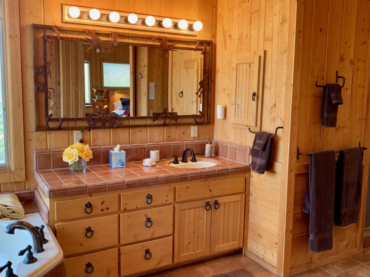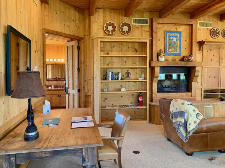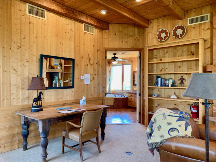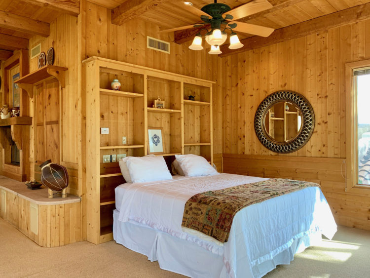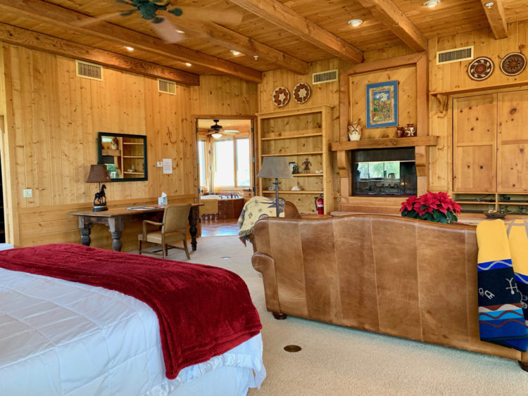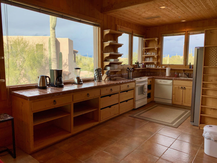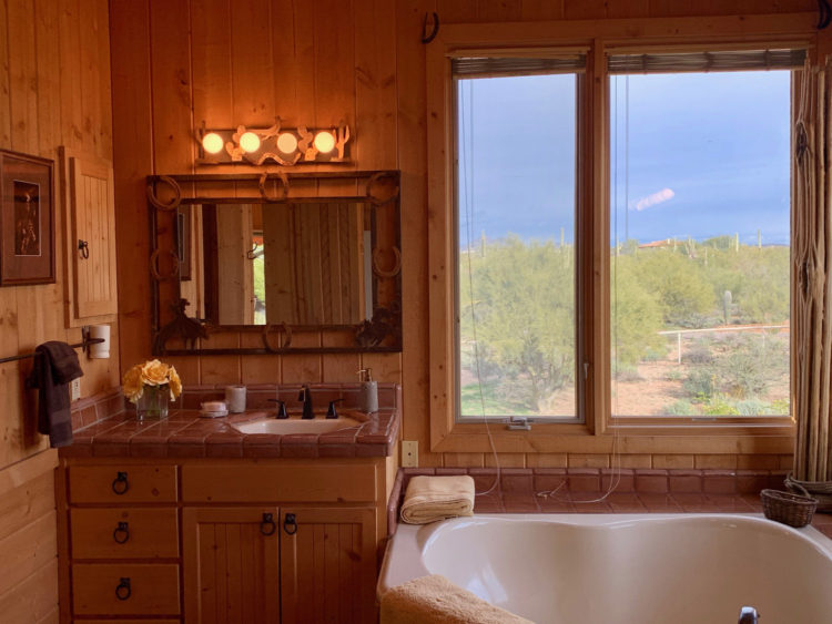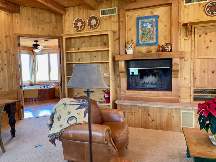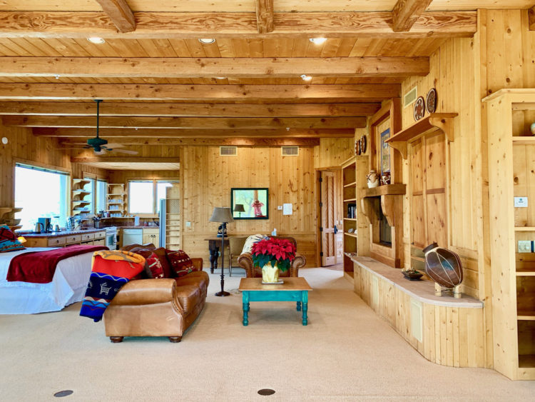 On the practical side, the loft is one huge open room with two king sized beds totally separated from each other. It includes a completely stocked kitchen, pantry, large bathroom, tons of storage and antique leather and wood furniture. The bathroom has beautiful views of the mountains and surrounding desert through the large windows surrounding the huge triangular soaking tub. There is also a separate, toilet, shower, washer/dryer and two large closets.. This largest of our three casitas also has a very huge closet (the size of a room) that can comfortably and privately accommodate a queen sized air mattress for additional guests. But keep in mind there is only one bathroom.