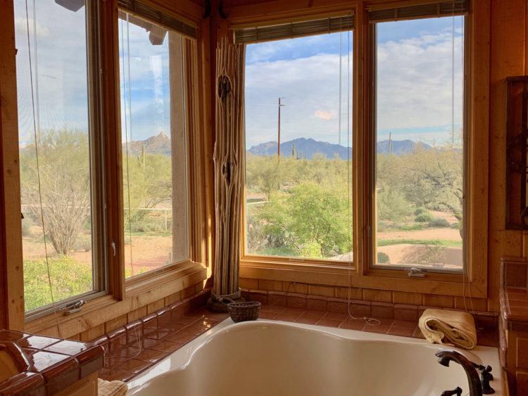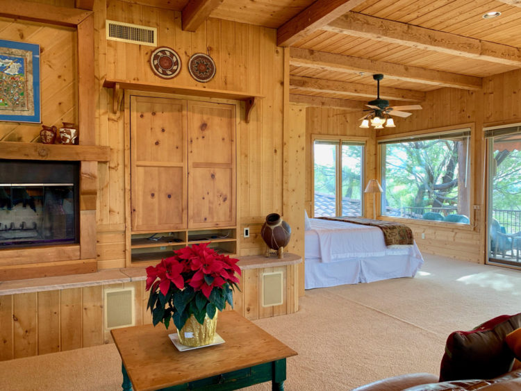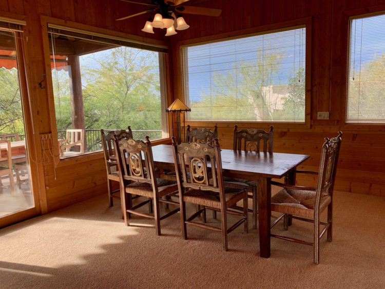 Pictures simply cannot convey the experience of this space. Every single person who opens the door to the “Loft” says the same thing. “WOW!!” A gorgeous scent of cedar and sunshine rise up to greet you the moment you enter. There is just something about a huge open space, high up in the trees that is just so appealing. Huge windows fill nearly every wall giving 360 degree views of mountains, saguaros, trees, flowers, desert, sunrises, sunsets in every direction. When you walk out onto the balcony you feel like you are high up in a huge tree house looking down upon the world, It is absolutely heavenly. You can completely open the extra wide patio doors making the space feel even larger to capitalize on the constant breeze and singing birds.