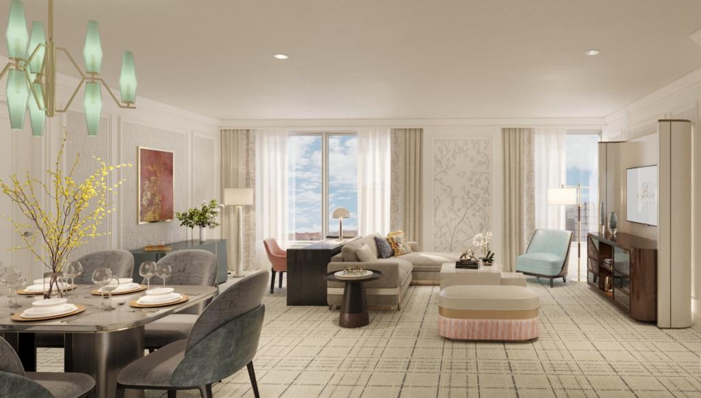 Well-appointed bedrooms will feature tufted cream-colored curved headboards, soft uplighting, custom TV armoires in a sycamore wood grain and floral touches in Italian fashion. Curvilinear sofas, benches and chairs will bring a whimsical yet comfortable elegance to the spacious living areas, while the suites’ luxe bathrooms will provide guests with custom vanities featuring lighted mirrors and upscale white marble surfaces, as well as motion-sensor lights for convenience and comfort.