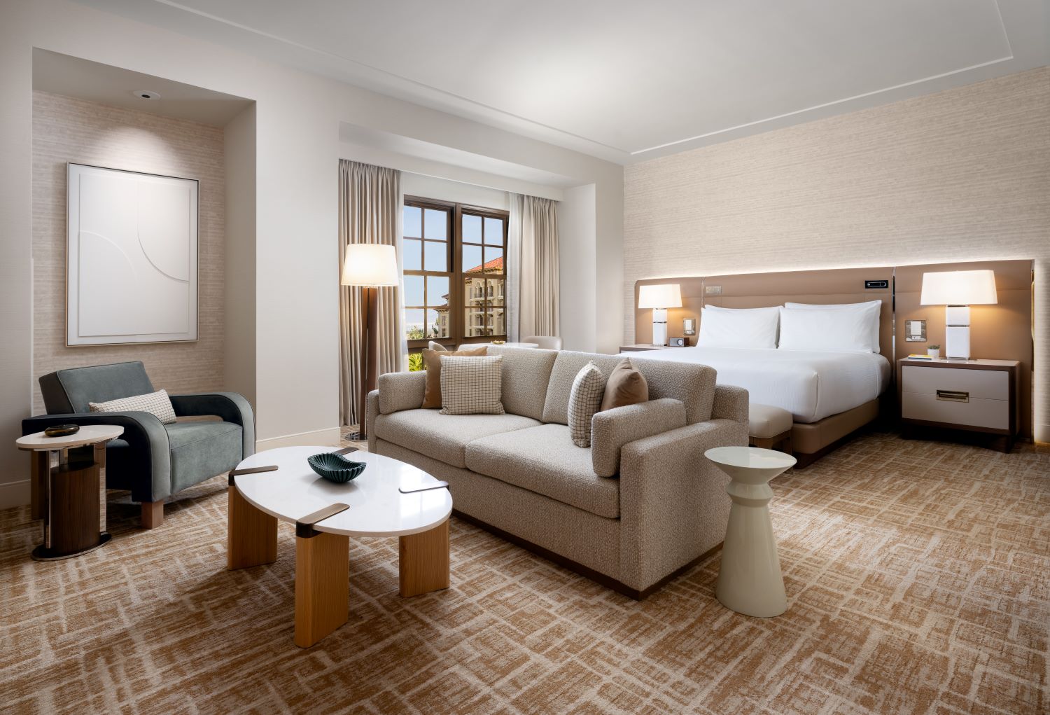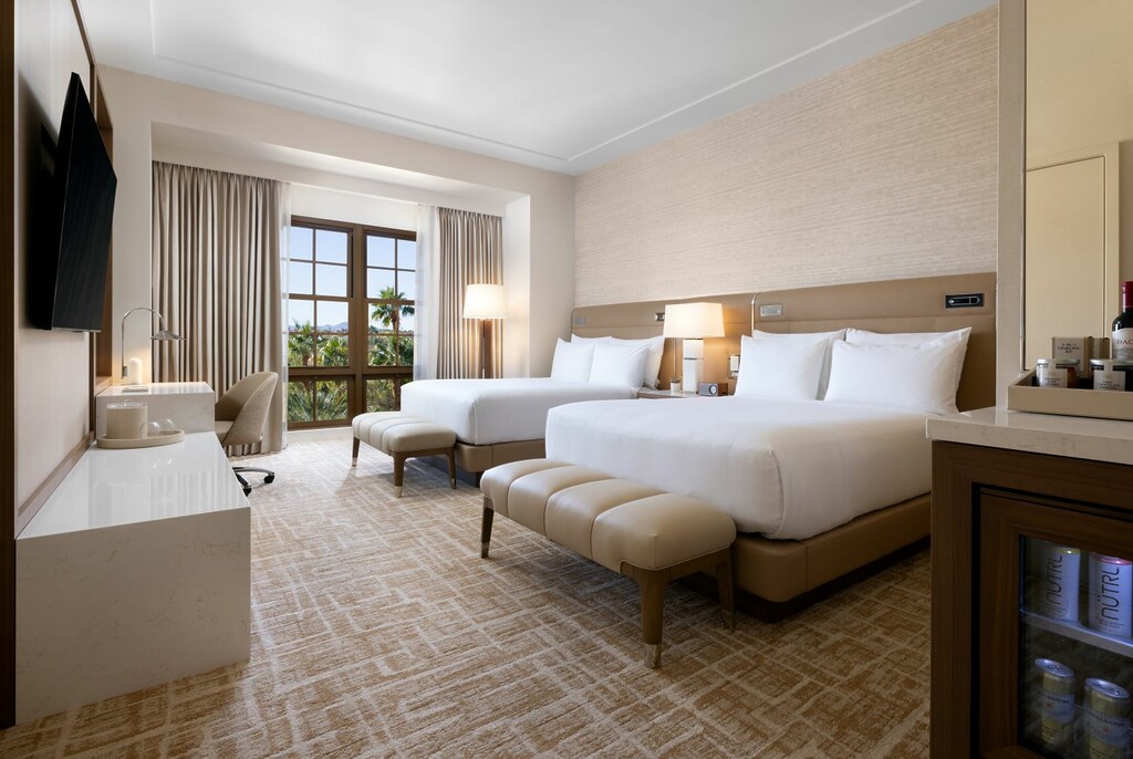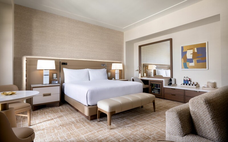 The 162 guestrooms and 37 suites of the West Tower blend warmth with refined detailing, offering guests a pied-à-terre inspired by European craftsmanship. Resort king, resort queen, and resort king with patio rooms span 495 square feet, while executive king, executive queen, and patio-equipped suites range up to 715 square feet.
