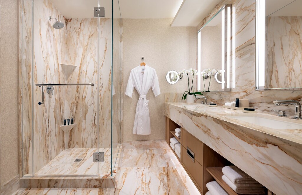 Each space features a palette of shagreen leathers and caramel tweed upholstery, stone surfaces, bookmatched Calacatta Macchia Vecchia marble, and layered lighting. Modern amenities include LED vanity mirrors, 65-inch smart TVs, Nespresso machines, plush robes, automated lighting control, and vintage-inspired analog alarm clocks, all designed to enhance comfort and convenience.