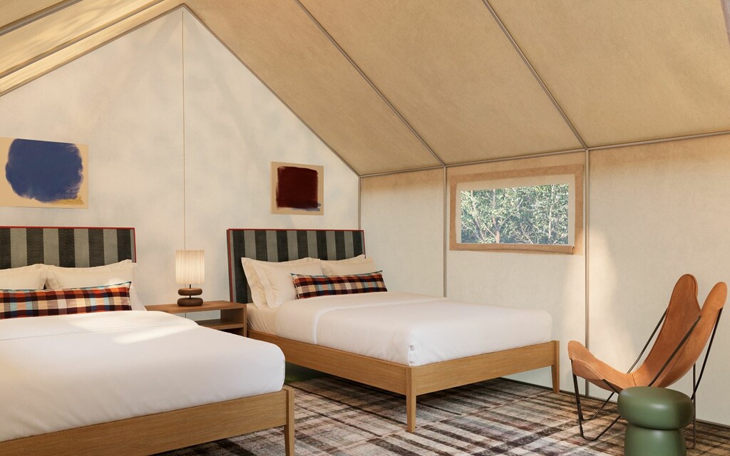 Tents designed by Creative Director Maggie Wilson and Jessie Galloway of Jessie Galloway Design invoke summer camp nostalgia through a contemporary lens.
