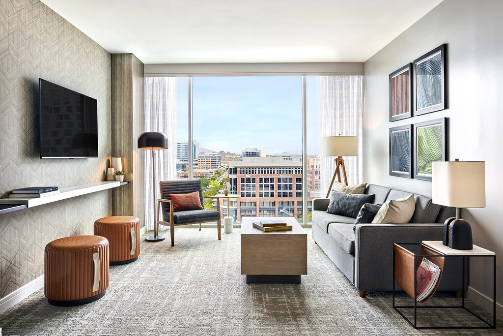 Guest rooms and suites are designed with a contemporary touch, featuring warm desert tones and modern furnishings. Inspired by the architectural heritage of ASU, subtle design elements create a unique sense of place. Thanks to floor-to-ceiling windows, guests can enjoy expansive views of downtown Tempe, Tempe Town Lake, and the surrounding mountains. Luxurious KLUR bath amenities, plush bedding, and refined finishes ensure an elevated and comfortable stay.