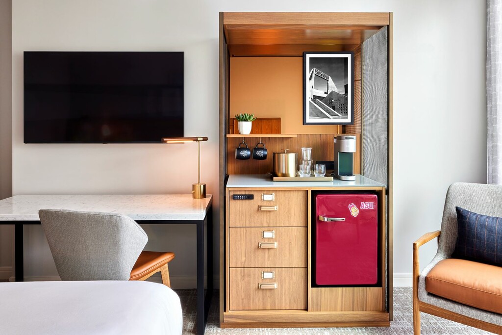 Omni Tempe at ASU is the newest hotel in Tempe, situated at the vibrant intersection of Mill Avenue and University Drive. Its design seamlessly blends contemporary luxury with inspiration from the Sonoran Desert and Arizona State University’s innovative spirit. This connection is reflected throughout the hotel, where ASU students, faculty, or alumni create every piece of artwork, strengthening the community’s bond.