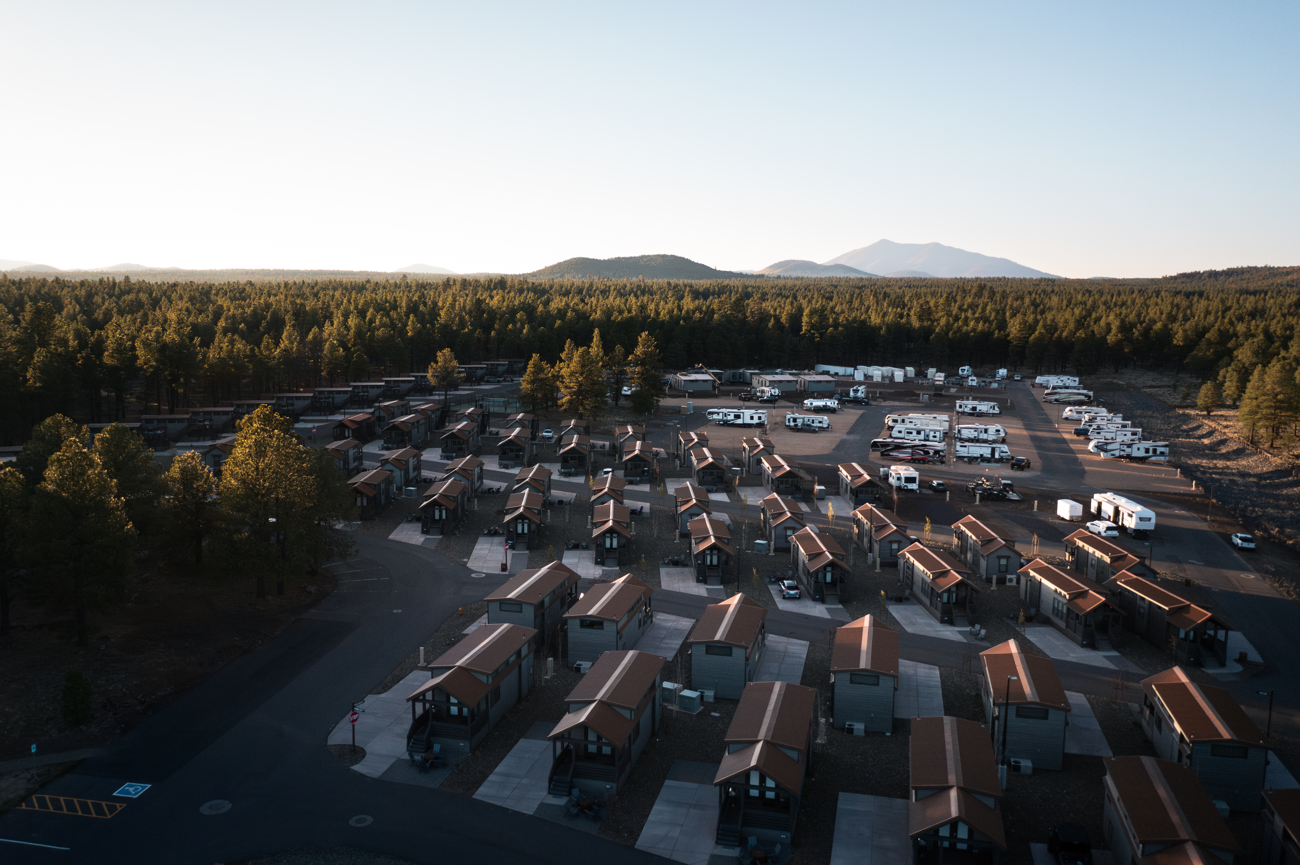 Set within this high-country landscape, Village Camp Flagstaff offers a stay that balances proximity to town with a tucked-away, nature-forward setting. Family owned and operated, the modern outdoor resort community is located about 10 minutes from downtown Flagstaff by car, making it easy to move between restaurants and shops while still feeling immersed in the surrounding ponderosa pine forest.
