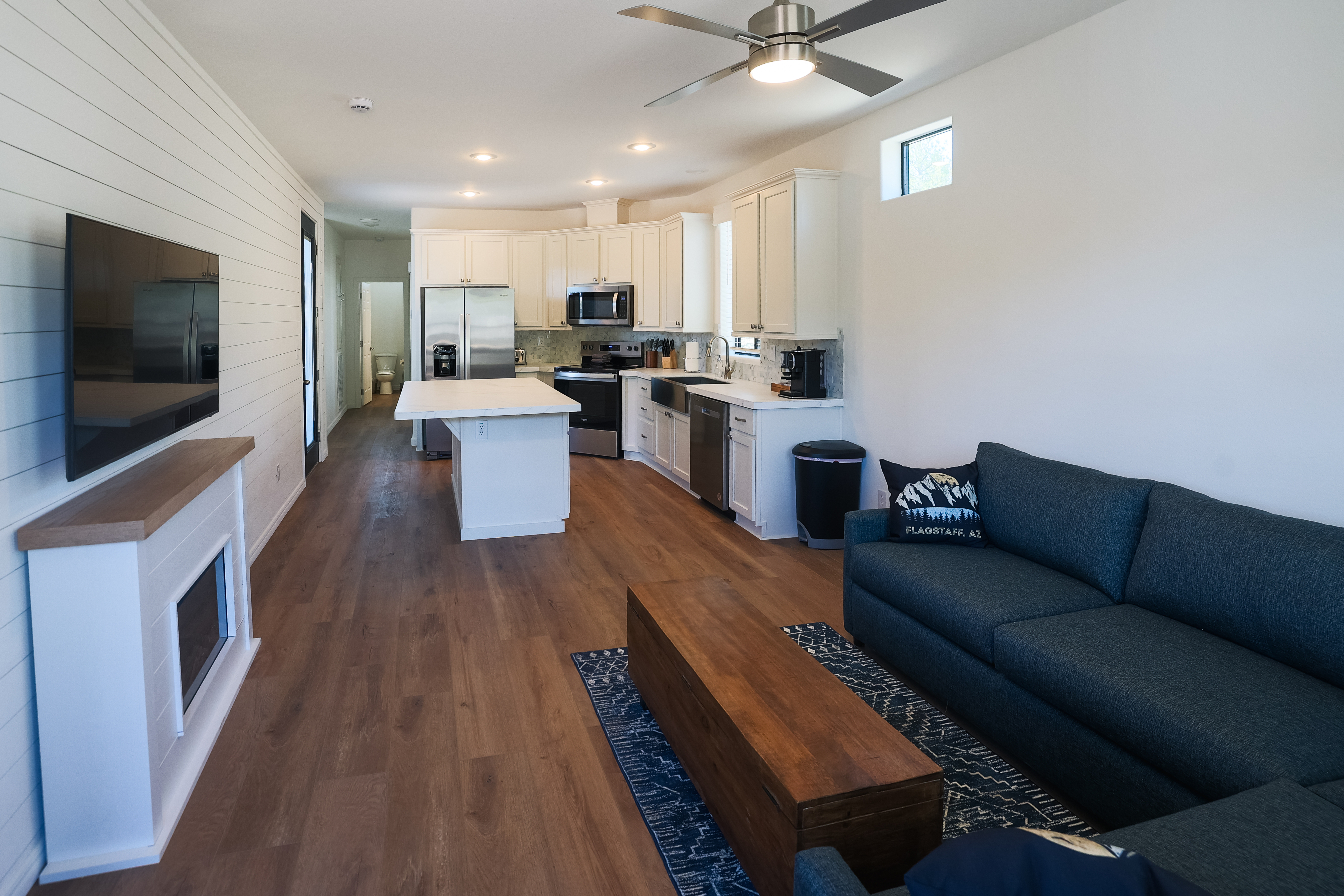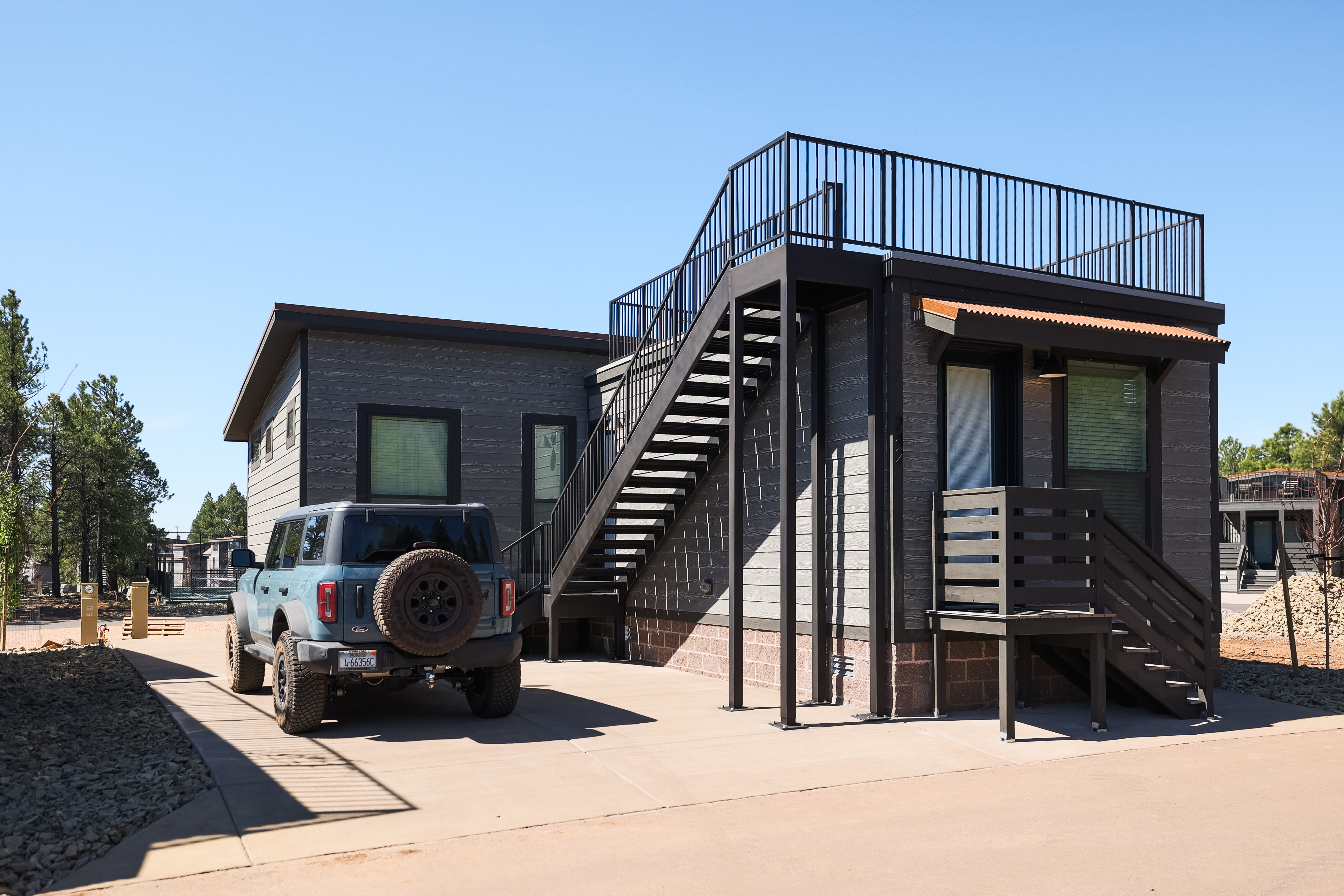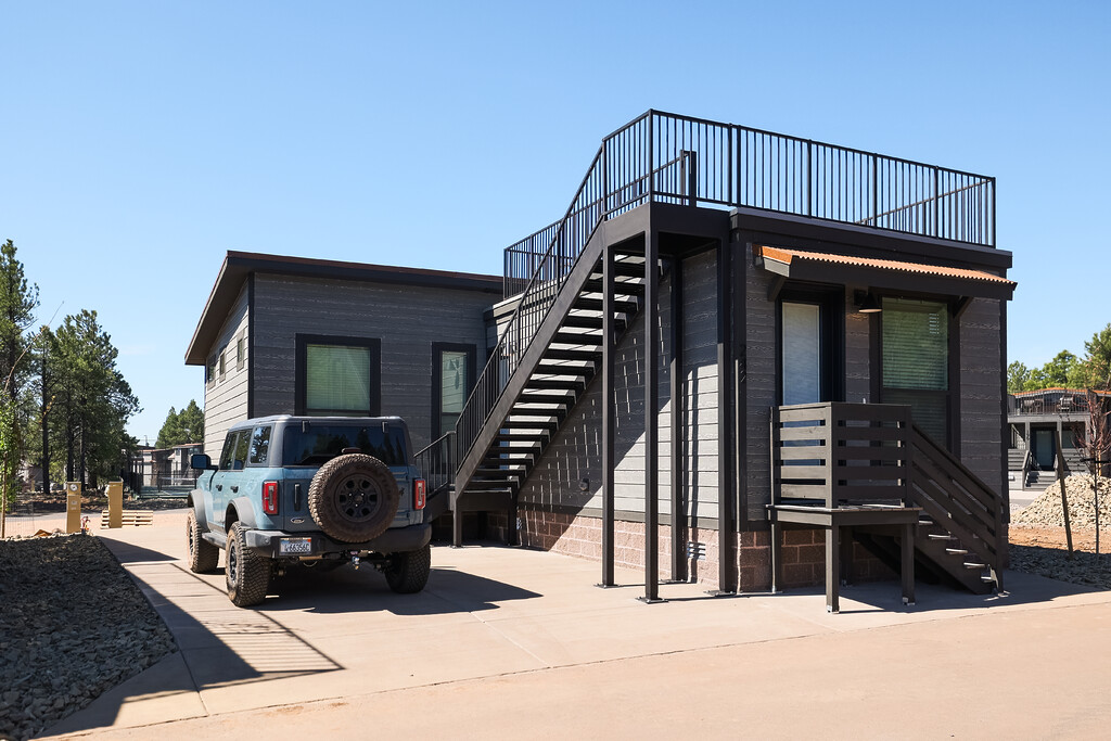 Accommodations span 11 cabin styles that can be reserved for a few nights or even purchased as a second home in Flagstaff. Depending on the model, cabins range from approximately 399–867 square feet and comfortably sleep between four and 10 guests. One standout option is the spacious three-bedroom Birch cabin with bunk beds and a rooftop deck, an ideal setup for families or groups looking to combine comfort with a sense of adventure. For RV travelers, Village Camp also offers three site types, including premium spaces outfitted with cozy fireplaces and Kona grills that make welcome evenings spent under the stars.
