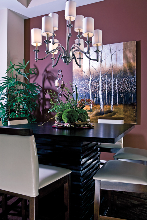 “We wanted to take advantage of the tall ceilings while making this a more intimate atmosphere,” says the Est Est, Inc. designers. To do so, Lilley and Scharf added a welcoming high-top dining table as well as created a red accent wall to set off the Venetian plaster ceiling. The ceiling is then detailed with a pretty polished chrome chandelier.