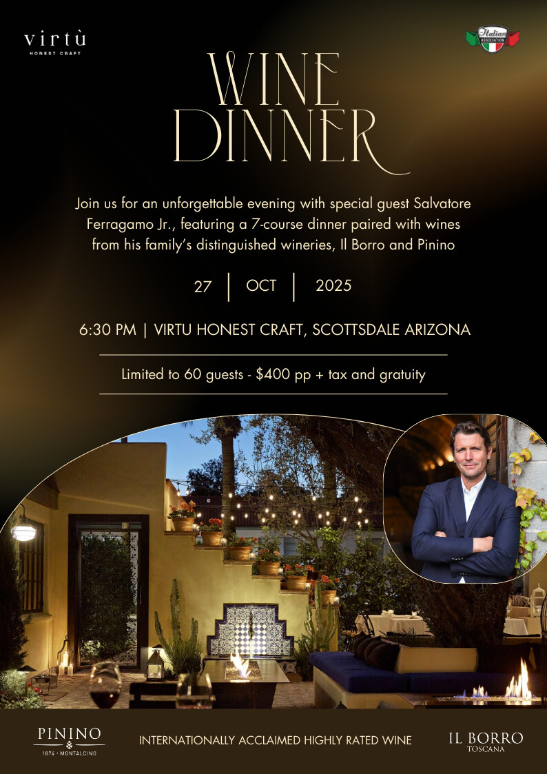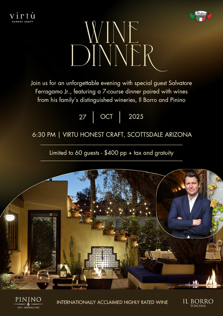 Mark your calendars for October 27, as Virtù Honest Craft in Scottsdale presents a truly exceptional evening of fine dining and world-class wine. For one night only, the acclaimed restaurant will welcome Salvatore Ferragamo Jr. — heir to one of Italy’s most legendary families — for a 7-course culinary wine experience.