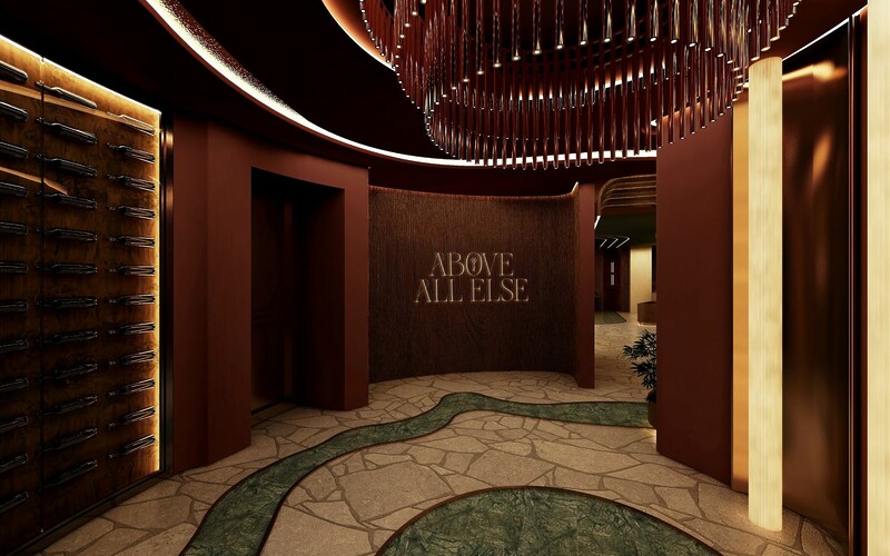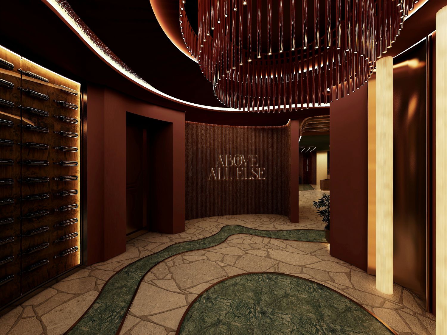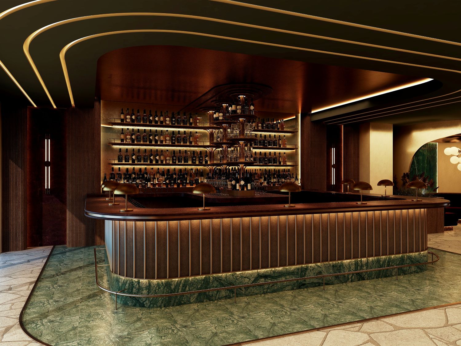 The concept began with a nod to classic English interiors, complete with deep jewel tones and rich textures. Over time, that inspiration evolved into a sleek, contemporary interpretation of luxury. Guests will find a space where Art Deco curves meet natural elements, where marbled walls and sculptural chandeliers cast a warm glow over intimate booths, and where organic inlays add softness to the sweeping, stylish surroundings.