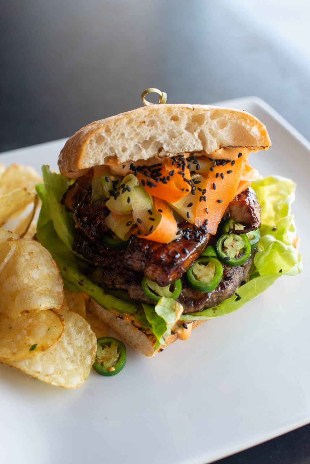 August 19: Miso Sticky (pictured)- 8 oz. Arizona-raised beef patty, miso-and-maple-glazed pork belly, pickled cucumber and carrots, red onion, thin jalapeño slices, butter lettuce, sesame seeds and gochujang aioli, on a bollio bun.