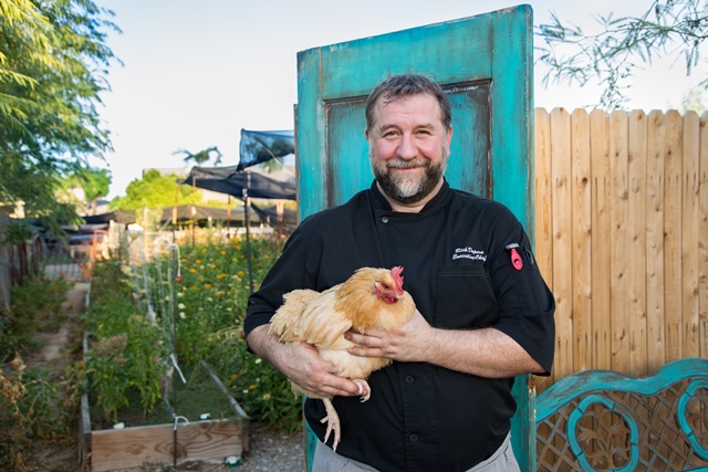 Diners are then invited to choose a seat at a long wooden table–accented with with rustic chairs and a burlap table runner, mismatched wine glasses, and flowers picked from the garden–while Kitchen West’s Executive Chef Rick Dupere (pictured) prepares the farm-to-kitchen feast. Sitting in the farm’s garden space under the starlit sky, diners savor an intimate family-style dinner with ingredients picked straight from the farm while Chef, Lylah and Michael share their passion for local, organic farm produce and quality cooking.