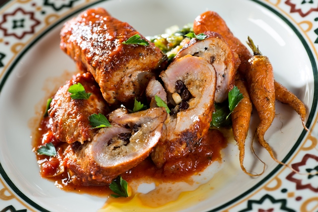Pork Braciole (pictured)~ pine nuts, currants, breadcrumb, spicy braised local organic greens, heirloom carrots, Pecorino