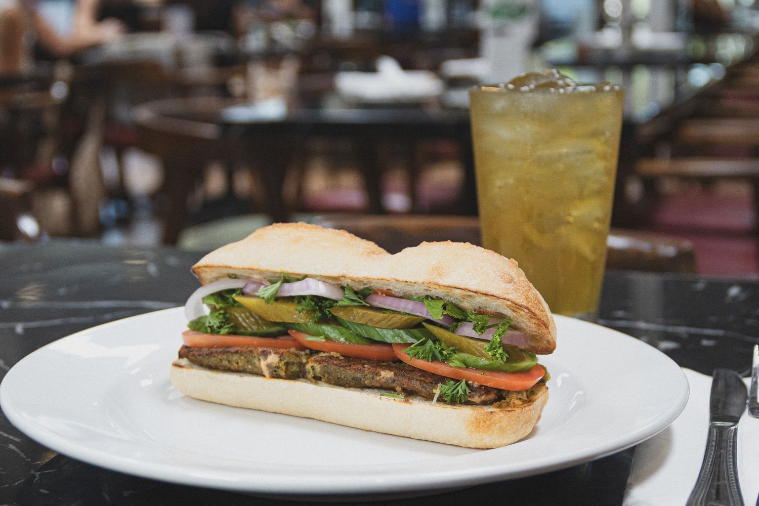 Vegetarian guests can check out the smashed falafel grinder, which includes baked falafel topped with tahini, Mediterranean pickles, cucumbers, tomato, onion, and fresh herbs, all wrapped in a toasted baguette with a kick of house-made sriracha.